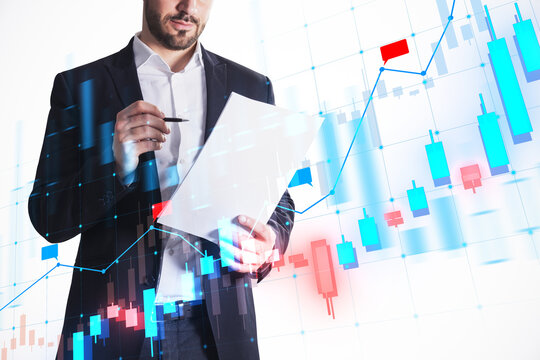 Businessman analyzing financial data on white background with a holographic stock chart overlay.