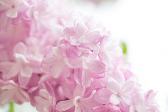 Pale pink beige neutral color little lilac flowers and closed buds on blur floral background for wedding invitation or romantic wallpaper macro