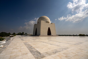 View of the Quaid-e-Azam Mausoleum, a striking white marble structure gleaming under a vast blue sky dotted with fluffy clouds, Karachi, Sindh, Pakistan.