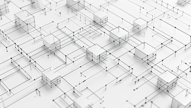 Abstract 3D rendering of a network of interconnected white cubes and thin black lines, suggesting a complex system or data flow