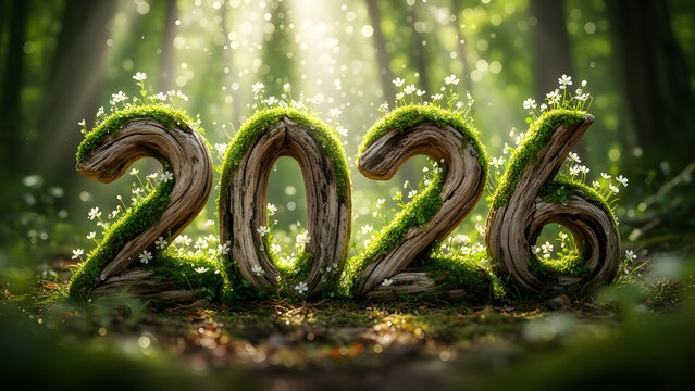 Sunny spring forest wooden 2026 numbers with moss and white flowers