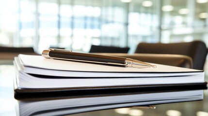 Black Pen on a White Notebook on a Reflective Desk in Modern Office