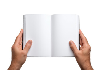 Open blank book with white pages resting on a dark marble surface, set against a blurred outdoor background with green lawn and pathway