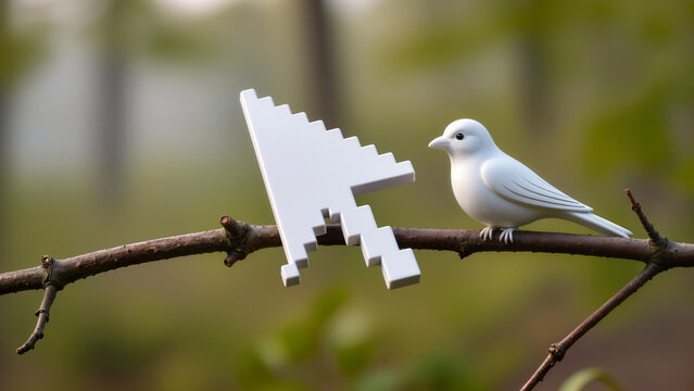 White bird sitting on tree branch next to pixel cursor arrow outdoors. Concept of digital nature, online interaction, and technology versus wildlife