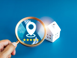 Home searching, choose the best location, house survey, real estate buying or property investment concepts. Location icon with five stars review in magnifier lens near white house on blue background.