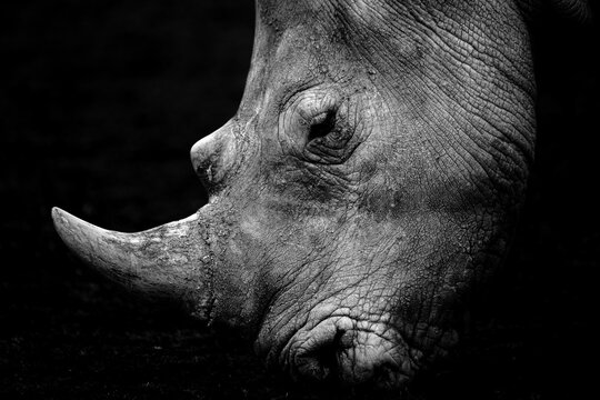 A closeup fine art portrait of a rhino in black and white with dark background. Concept: Dangerous beauty. Dangerous wildlife