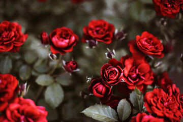Assorted roses heads on white background. Flowers and leaves scattered on a table, overhead view wallpaper. Flat lay, top view. Nice border. Decoration elements.