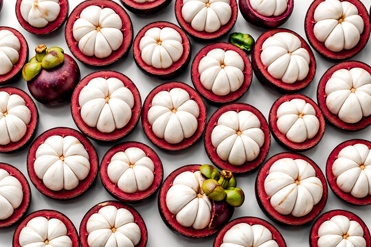 Exotic mangosteen fruit showcasing segmented pulp isolated against a bright white background, a delectable tropical treat ideal for healthy eating