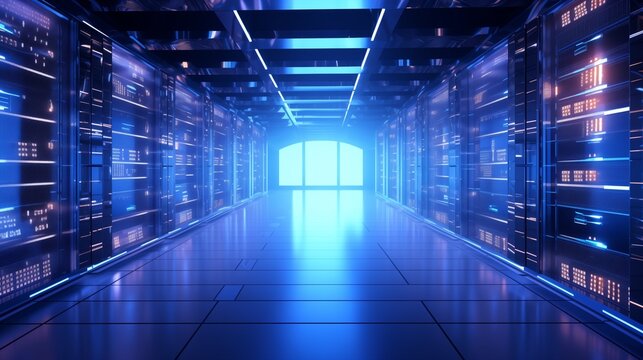 Futuristic blue data center with holographic code overlay and glowing server racks, neon