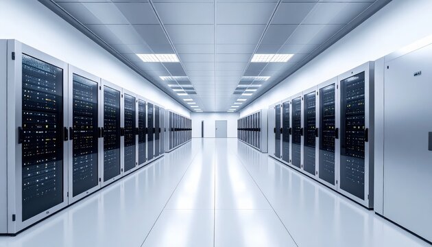 Data center interior with rows of server racks inside bright and clean center hallway
