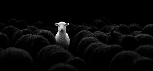 A 3d white sheep among black sheep represents inverted concept of leadership and individuality, rejecting societal norms and embracing rebellion in the crowd.