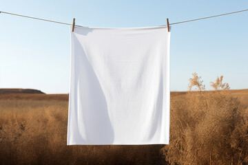 Minimalist workspace with blank rectangular sheet on white desk