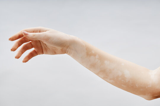 Close up on female arm in elegant gesture showcasing skin with vitiligo patches in beautiful unique pattern against white background in studio, copy space