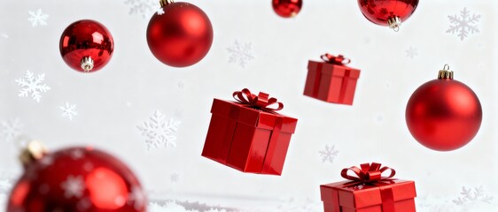 Red Christmas ornaments and gift boxes falling against a white background. Festive winter holiday celebration with snowflakes and snow. Banner with copy space
