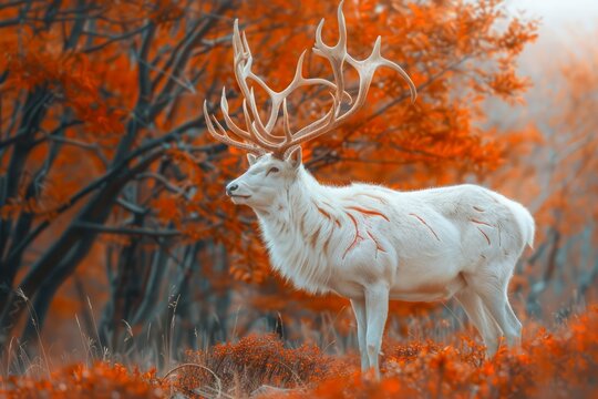 Majestic White Stag in a Magical Autumn Forest with Fiery Orange Foliage