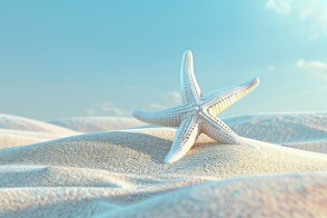 A single white starfish lies on a pristine sandy beach under a clear blue sky, capturing the essence of a tranquil summer day.