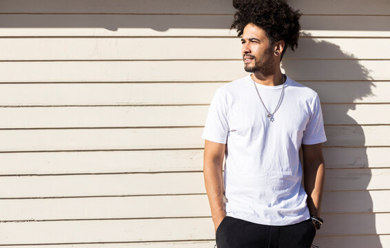 Serious black man with casual outfit posing over white background looking away