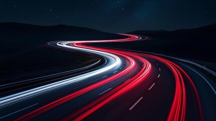 Curved highway with flowing red and white light trails under a starry night, long exposure, sleek road design, dynamic motion, serene landscape contrast