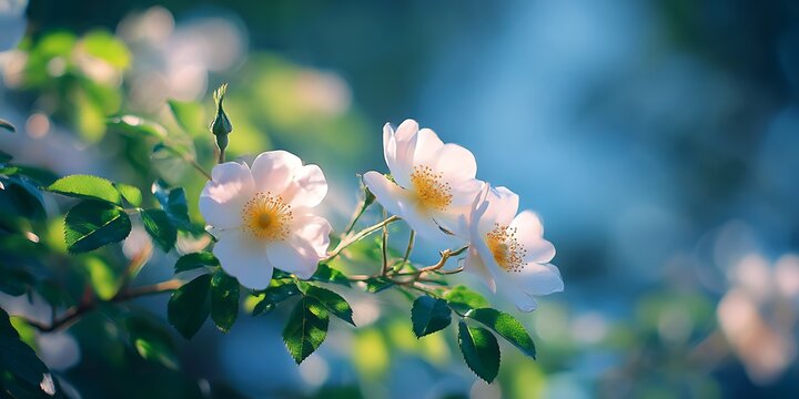 A beautiful banner with white wild roses and a blue sky in the background, in a minimalistic style, high-resolution photography, high detail, hyper-realistic, cinematic.
