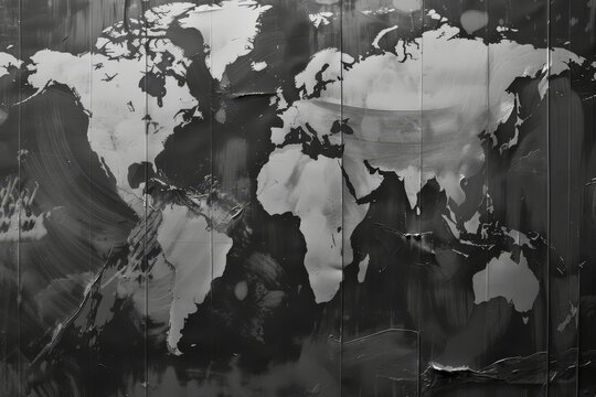 black and white photo of world map, grayscale brushstroke background, infused seamlessly with copy of the global map and coordinates annotated in an intricate typeface