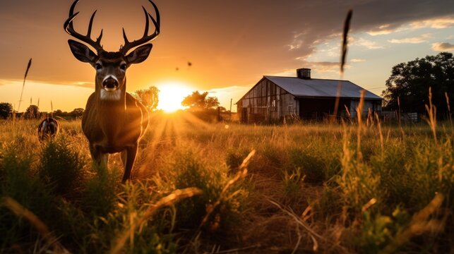 Silhouette of white tailed deer of Texas farm, sunset, natural light