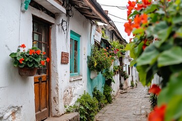 A narrow cobblestone street, flanked by whitewashed buildings with wooden doors and shutters, basking in sunlight. Vegetation in pots adorns the space