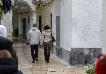 a couple in winter jackets walking away down a narrow, wet, cobblestone alley lined with whitewashed stone buildings and drying laundry in a historic mediterranean town