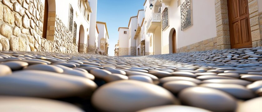 Beautiful cobblestone street in a traditional village with whitewashed buildings on a sunny day