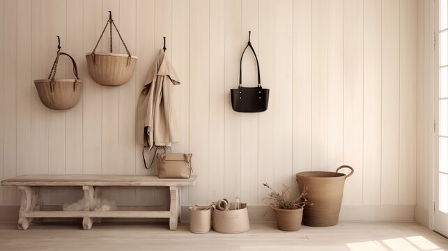 Coastal beach house living room with whitewashed walls, wicker furniture, and ocean-themed decor, Taken by Nikon Z7 35mm lens