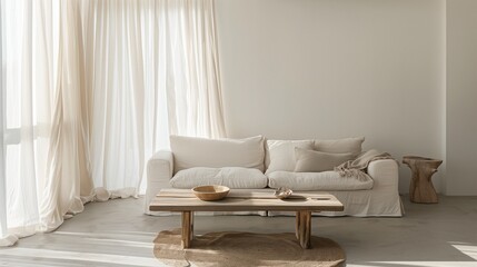 A coastal-inspired minimalistic living room with whitewashed walls, a linen sofa, and a driftwood coffee table. Sheer curtains billow gently in the breeze, filtering sunlight.