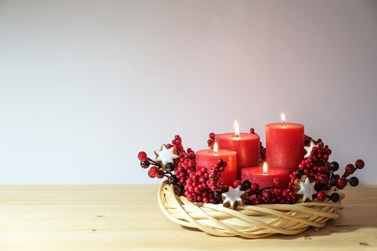 Advent wreath from willow wicker with four lighted red candles cinnamon star cookies and berries holiday decoration for Christmas time copy space selected focus narrow depth of field