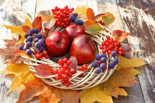 Wicker wreath with viburnum,, grapes, apples , maples leaves