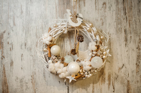 Beautiful Christmas wreath decorated with white balls, pine cones, cinnamon sticks and cotton flowers.