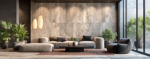 Luxurious modern living room with light gray marble and large windows, a serene open space for relaxation