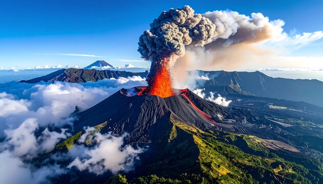 Erupting volcano spews ash & lava amid clouds & lush hills, under a vibrant blue sky, creating a striking contrast