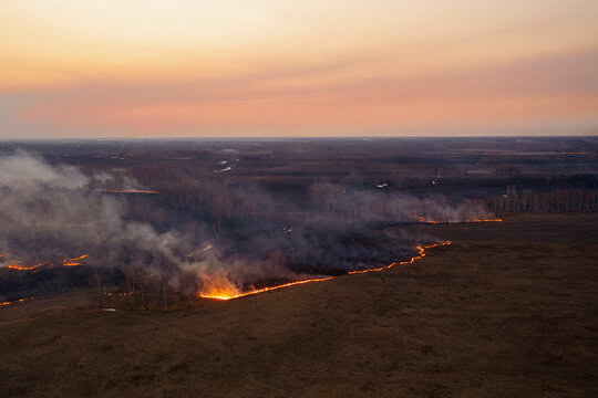 Dangerous wildfire going to meadow under sunset sky
