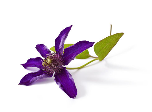 white clematis flower on a green background close-up. white leaves and a purple middle. selective focus. home gardening. for postcards