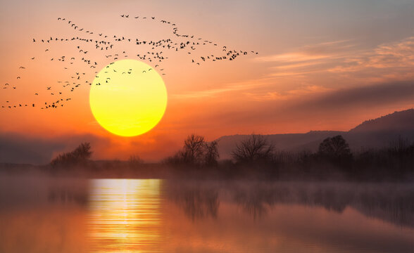 A migrating flock of geese flying in V-formation across a lake at sunset sky.