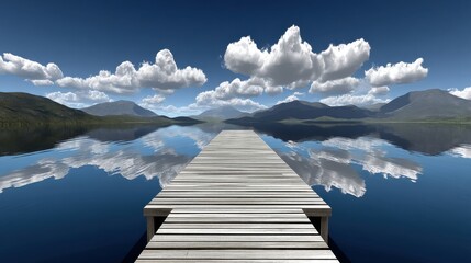 A wooden dock extends over a calm lake reflecting the sky and surrounding mountains