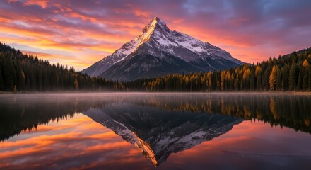 Serene Reflection of Majestic Snow-Capped Mountain at Sunrise Over Calm Lake