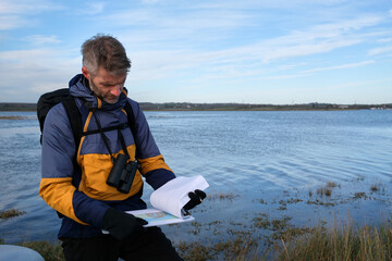 Environmental Scientist Reviewing Ecological Restoration Project Data on Clipboard in Wetland