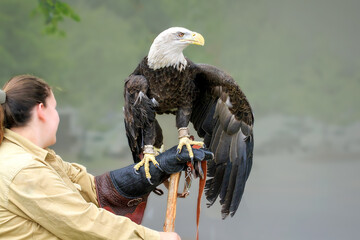 American bald eagle  in captivity  going through rehabilitation from injury, tethered and standing on a leather glove.
