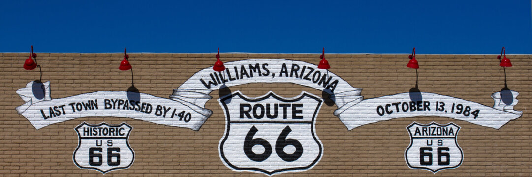 Route 66 Williams Sign at Bill Williams Avenue in Williams, Arizona, USA