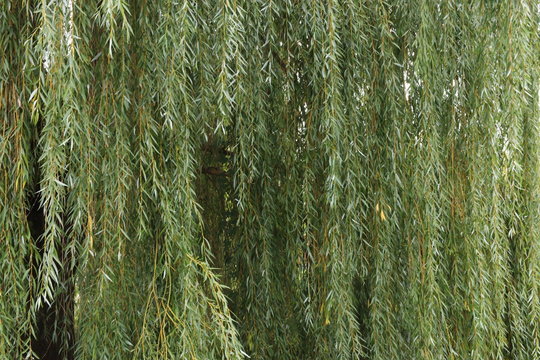 A picturesque summer day under a weeping willow tree, its graceful branches hanging down in a gentle dance.