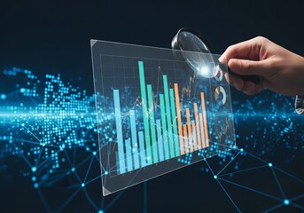 Hand holding a magnifying glass over a digital chart with glowing data points and network connections, symbolizing data analysis and business insights