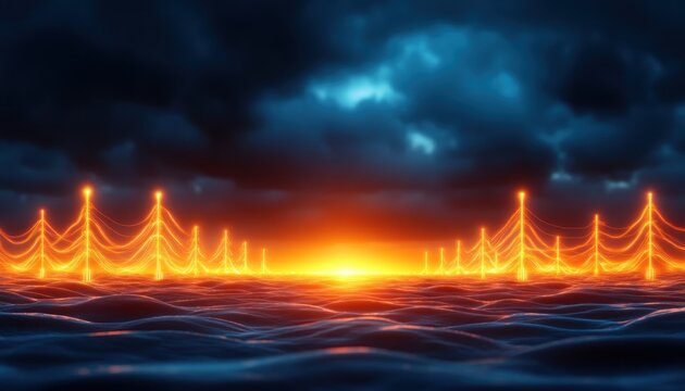 Holographic energy network projecting over wind farm showing real-time data readouts