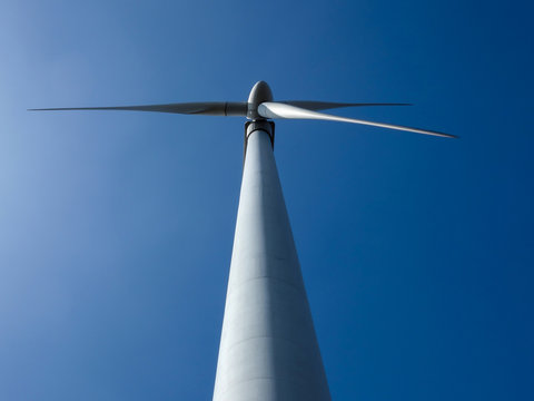 At bottom of tall wind turbine tower with spinning blades under clear blue sky