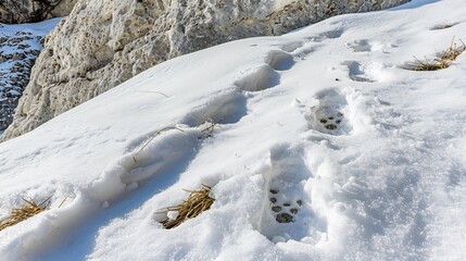 Snow leopard tracking footprints in snow covered cliffs, wind swept ridge line, editorial storytelling, 2025 trend conservation theme