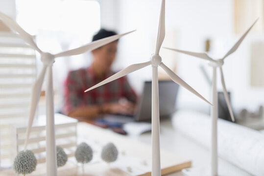 Models of wind turbines in an office of a renewable green energy start-up