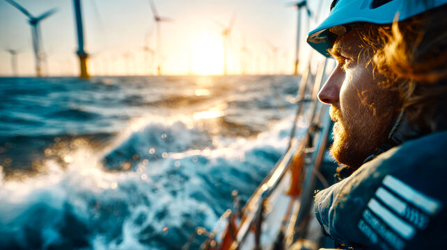 Man in boat watching turbines at dusk. A man gazes at wind turbines while sailing in choppy waters during a vibrant sunset at sea.
